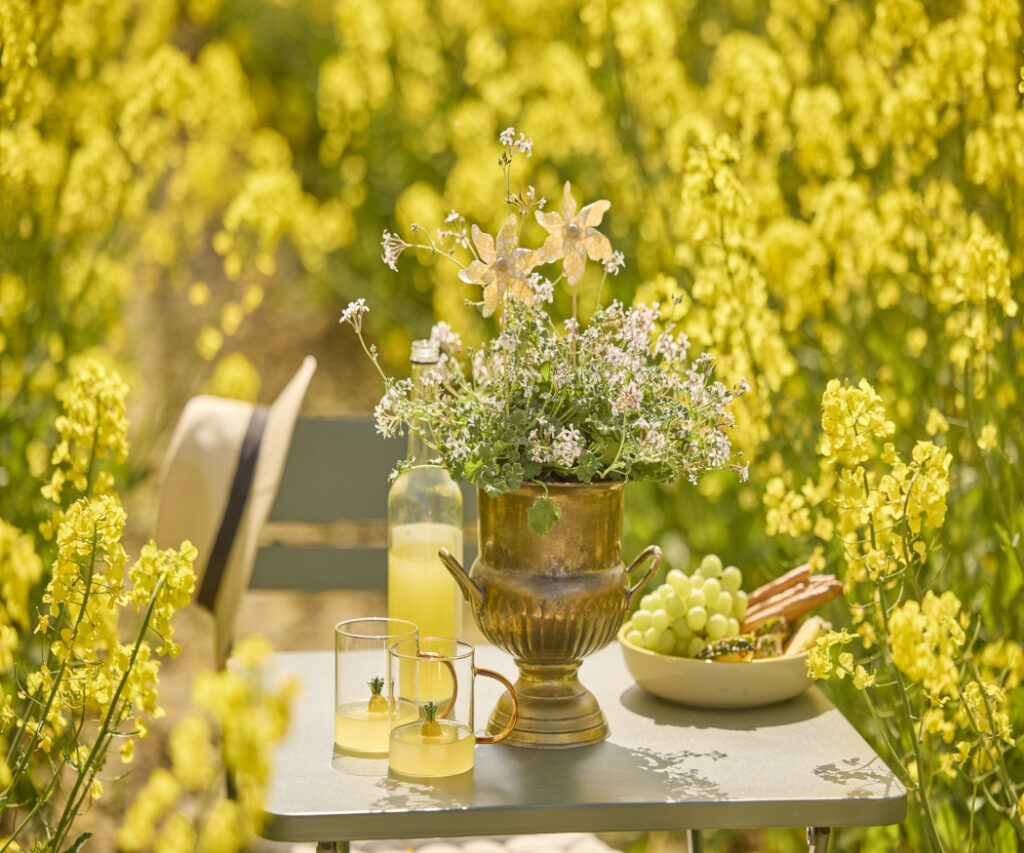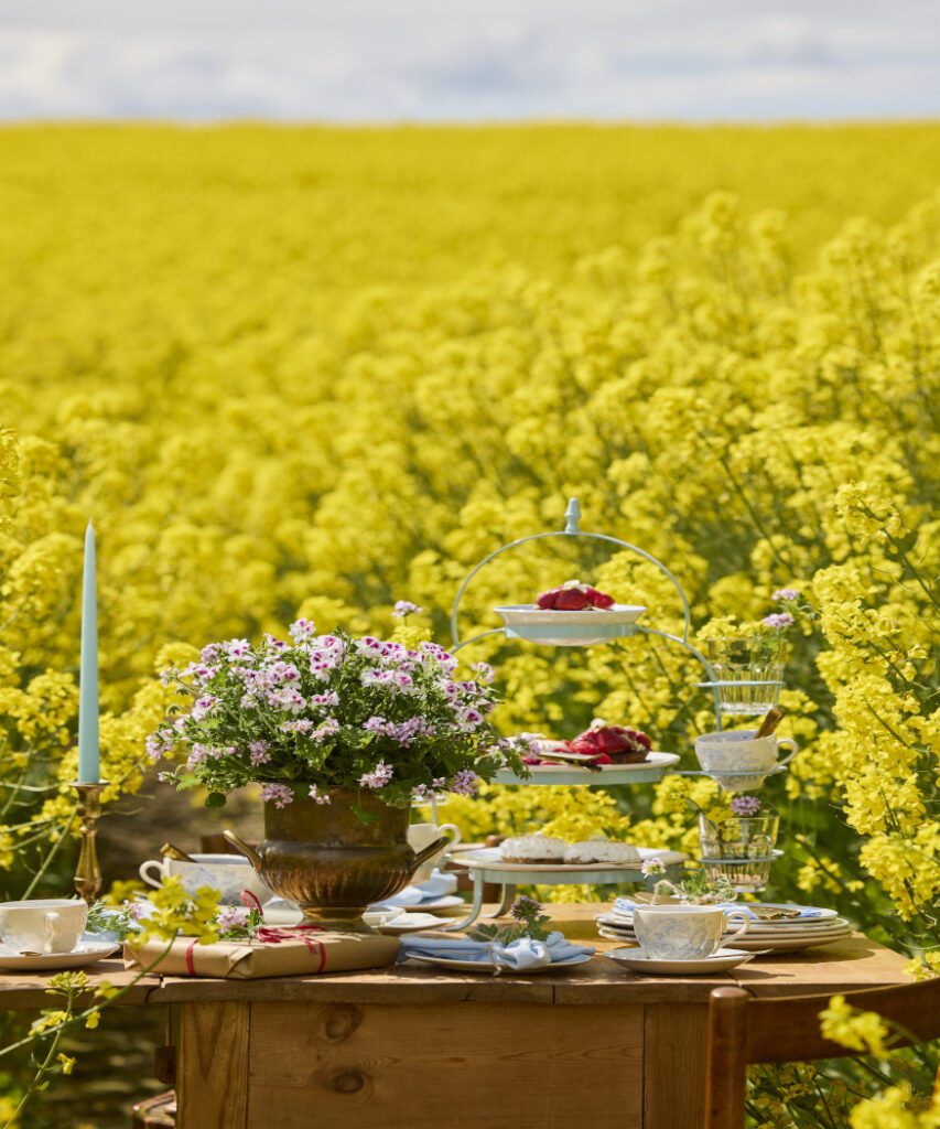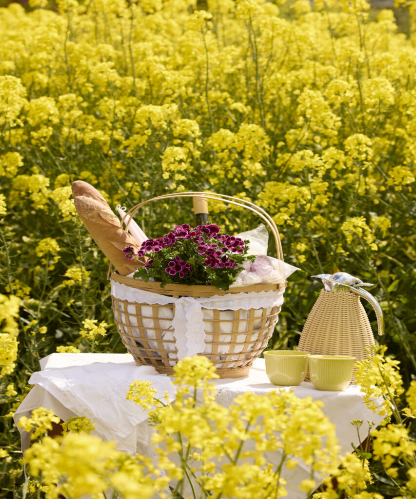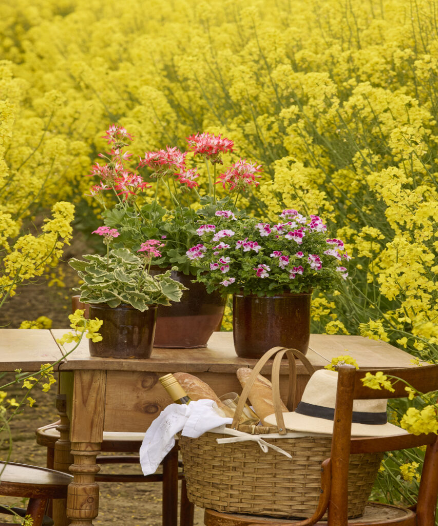 Below: A lovingly laid table in front of a field of flowering rapeseed encourages you to relax and unwind. Geraniums blend harmoniously with this natural setting. Whether in a ceramic or terracotta pot, a weathered metal container, or a rustic wicker basket, their bold colours contrast beautifully with the bright yellow and undulating landscape of the rapeseed field. Everything seems slightly imperfect and improvised, which is precisely what makes it so appealing.
