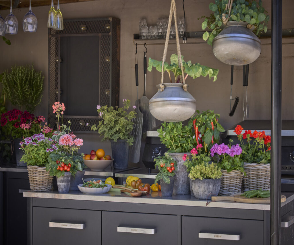Right: This stylish outdoor kitchen on a covered veranda represents modern country living at its best: it’s functional, close to nature and beautifully designed. Surrounded by aromatic herbs, tomatoes and other vegetables, geraniums — including edible scented varieties — provide a splash of colour and inspire creative cooking.