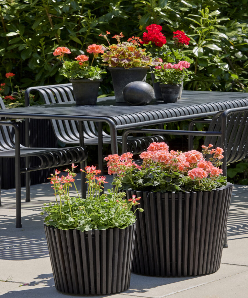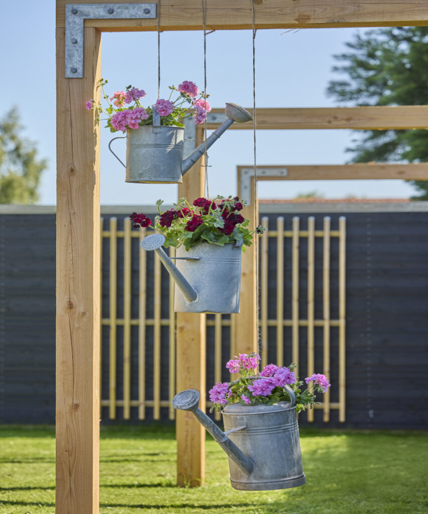 Combined with hanging zinc watering cans planted with geraniums, it creates an exciting contrast between structure and playfulness. A creative idea for modern gardens with character.