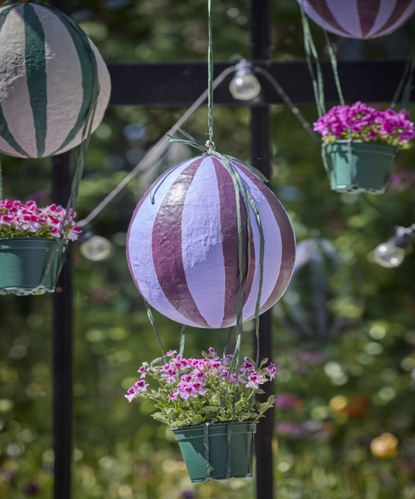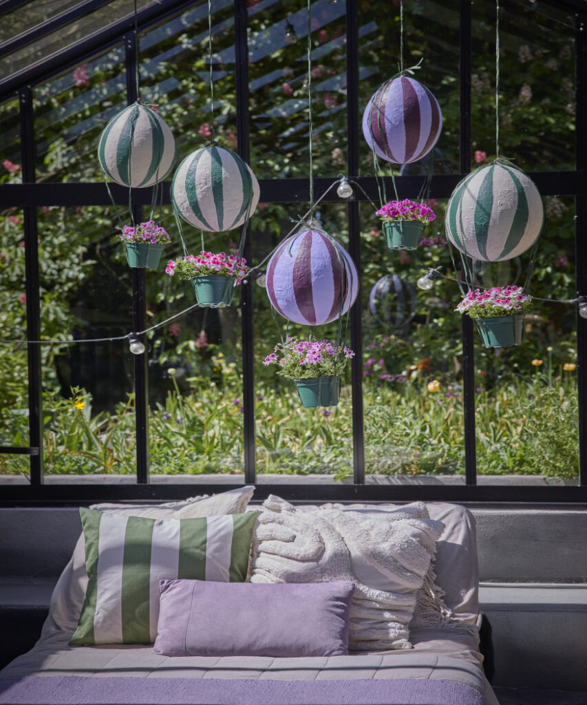 Left: To add a playful touch to a natural, modern aesthetic, this craft idea is a lovely addition: geraniums in brightly painted plastic pots are suspended below hot air balloons above a daybed in a conservatory.