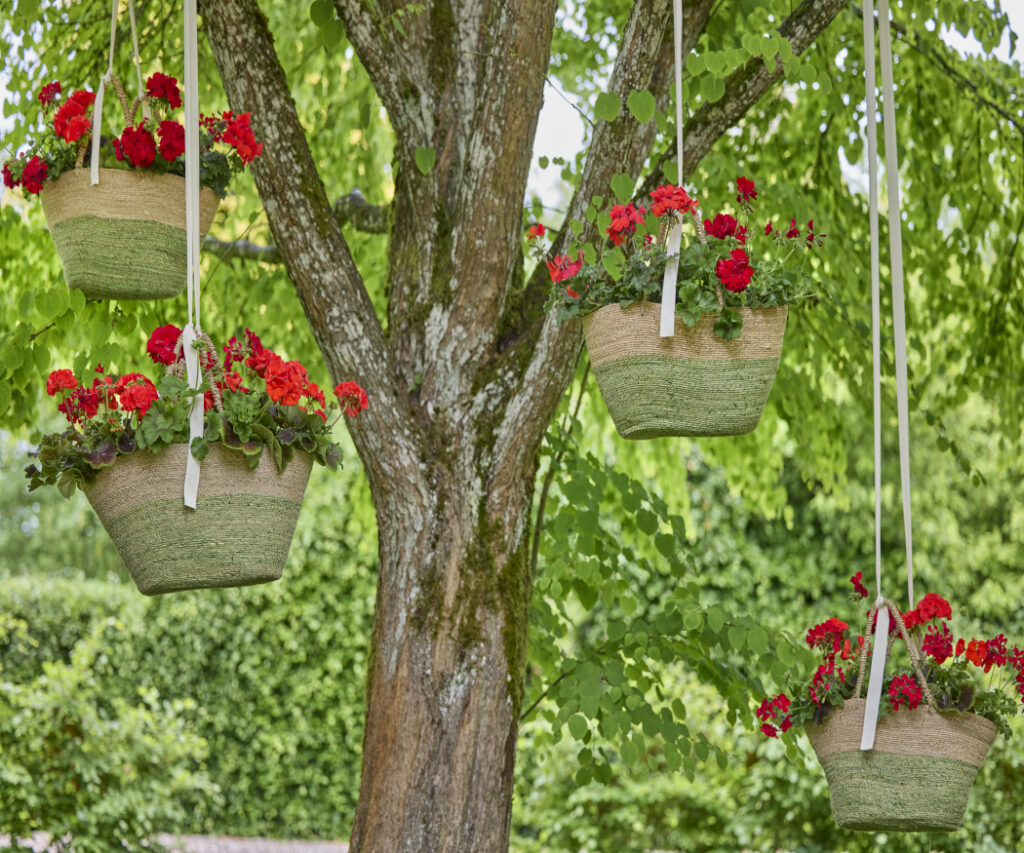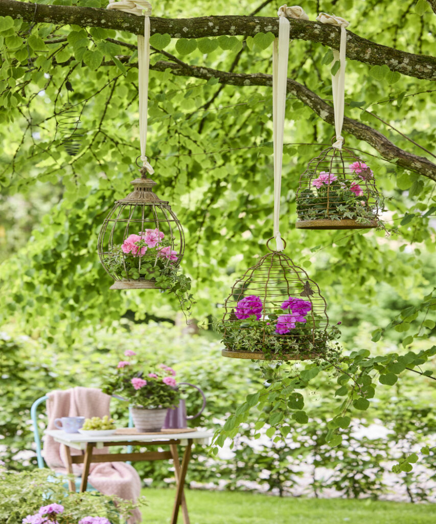 In old vintage-style birdcages or raffia bags hanging from long ribbons in the branches, colourful geraniums are transformed into suspended focal points.