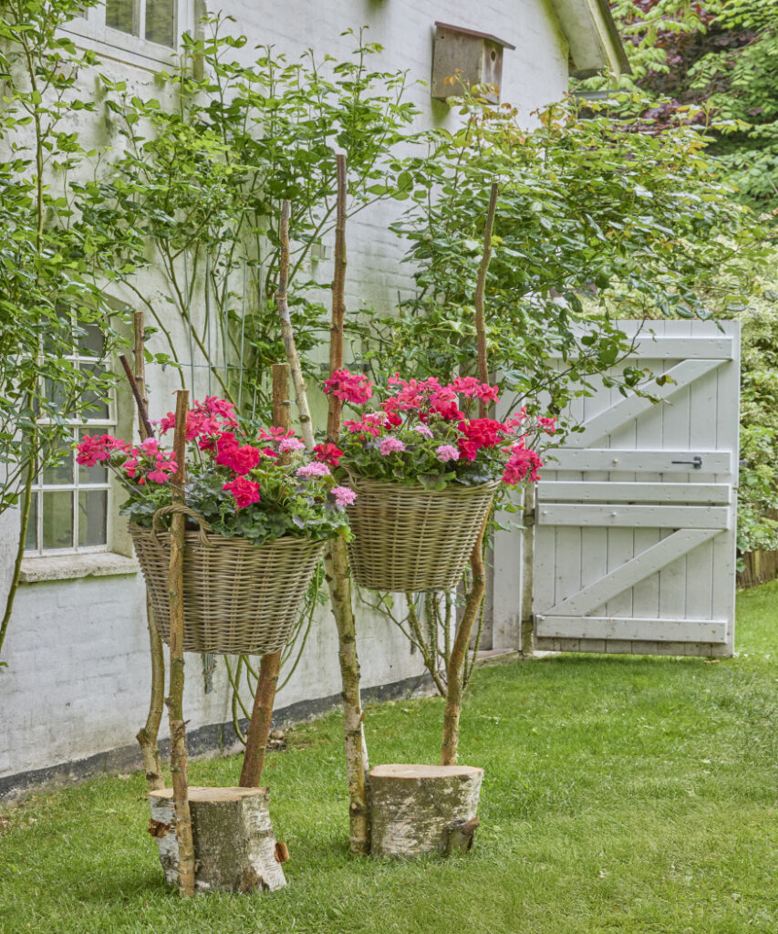 Left: These handmade, rustic plant stands, made using natural wood and decorative baskets make a stylish showcase for geraniums and bring lots of personality to this garden.
