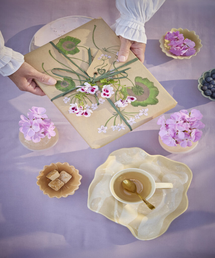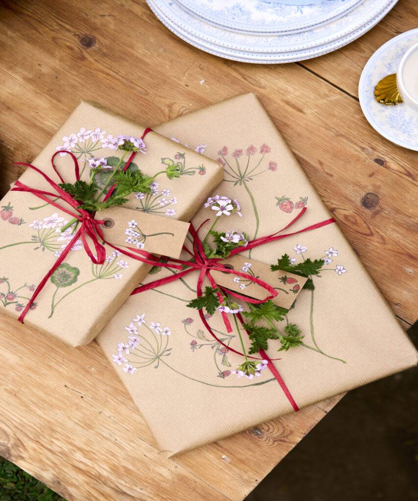 This creative packaging features geranium illustrations on paper alongside real flowers, artfully tied with raffia.