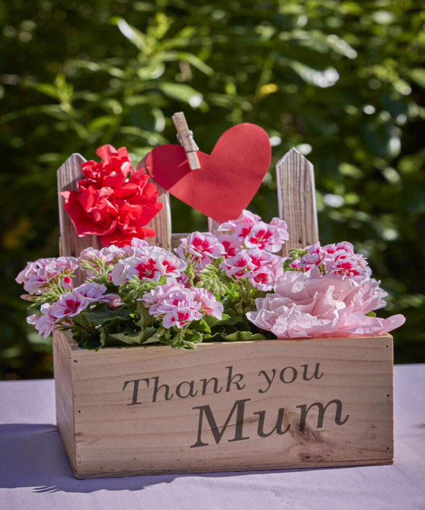 For example, turn a simple wooden box into a decorative miniature balcony box filled with pink and fuchsia geraniums, full of summer joy. Adding personal touches such as a heart-shaped note to the miniature garden fence and an occasion-appropriate label on the box makes the gift even more meaningful.