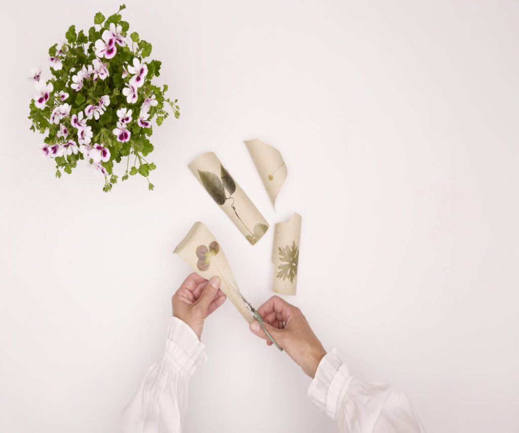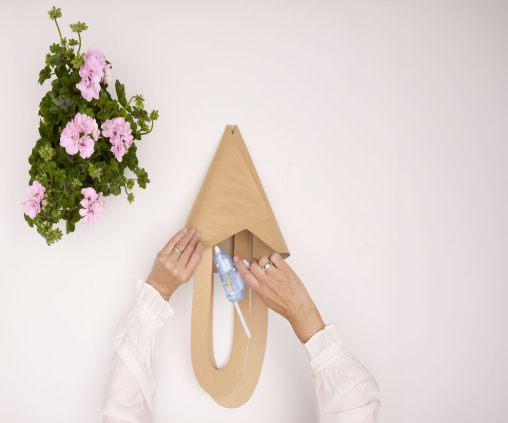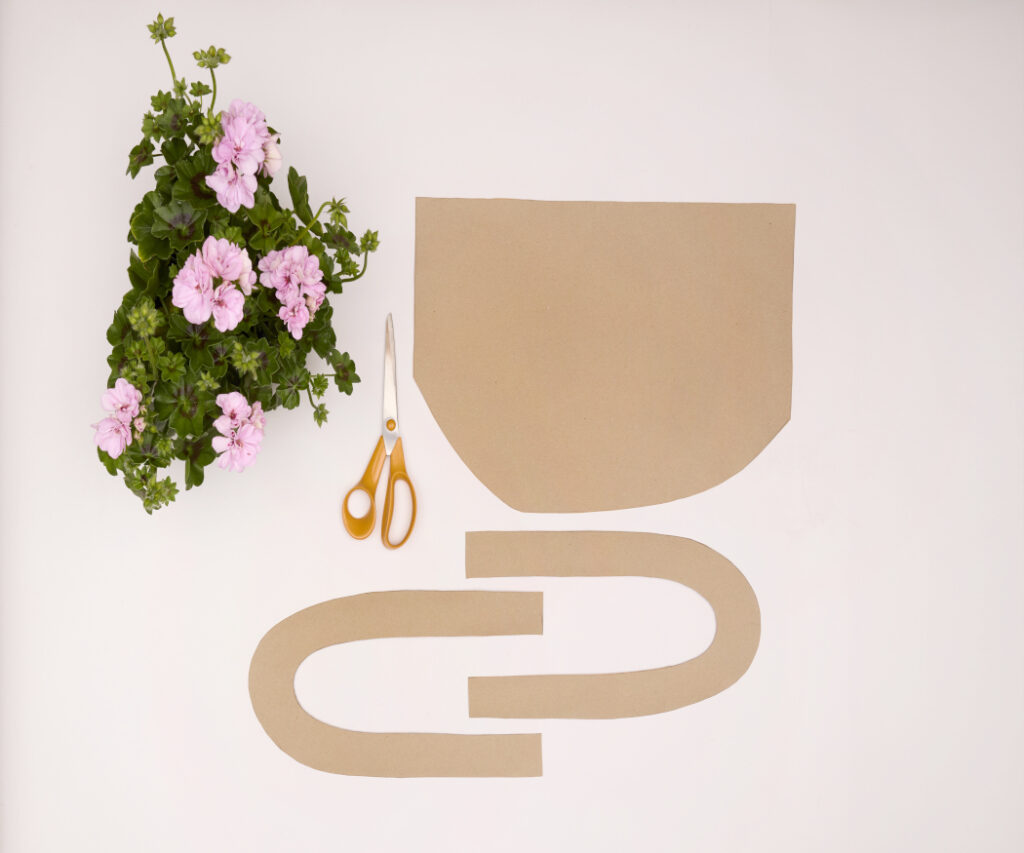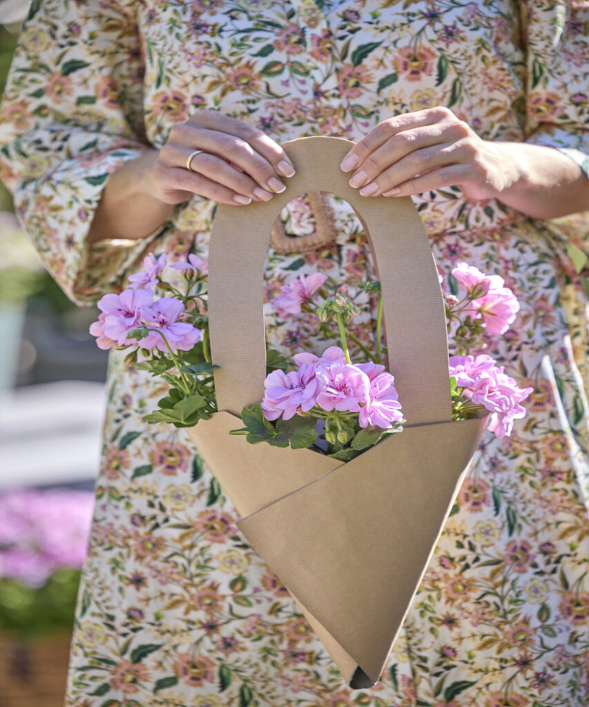 This homemade packaging is both sturdy and decorative, and can be made in no time – perfect for those spontaneous summer visits! For this craft project, you will need an A3 sheet of stiff cardboard, brown wrapping paper, a pencil, scissors or craft knife, a ruler, a hot glue gun with glue sticks and a flowering potted geranium.