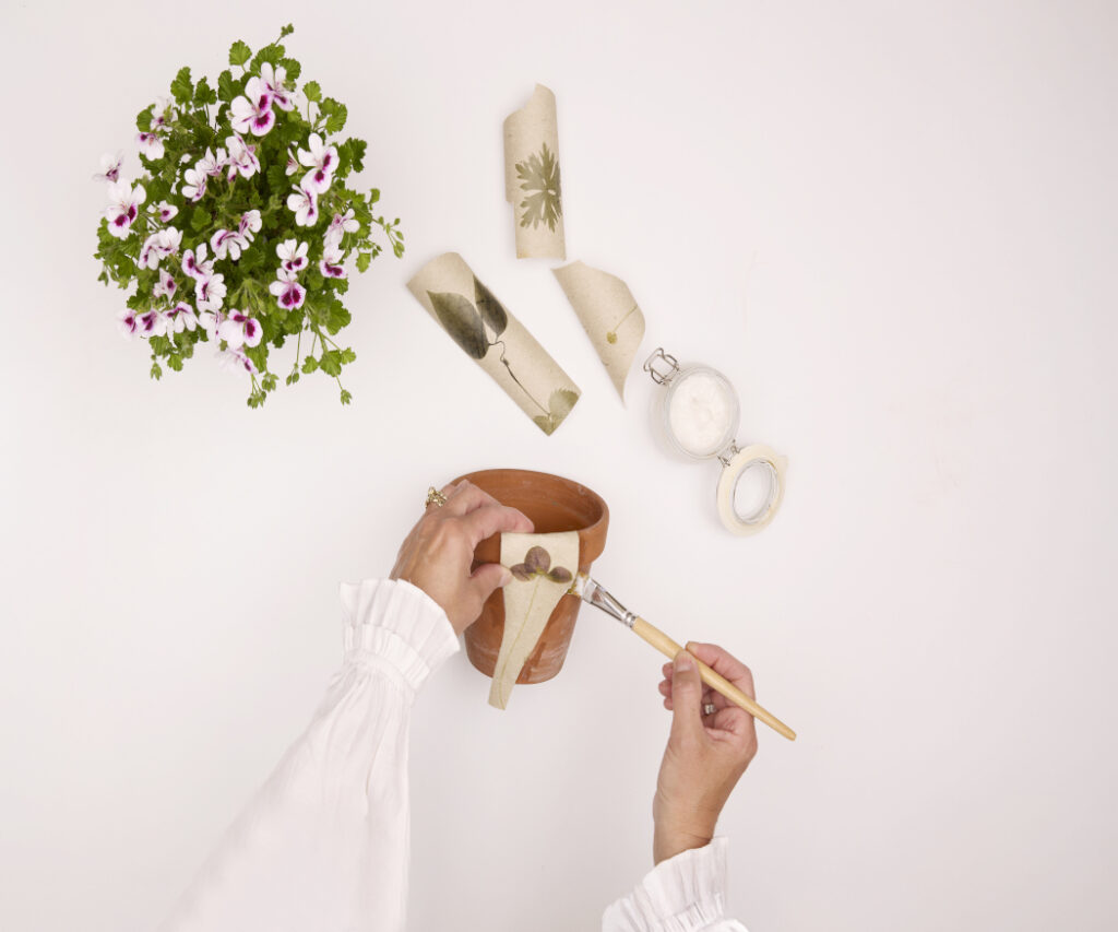 Step 5: Leave the paste to dry thoroughly. Coat with matt varnish to protect your design and ensure a long-lasting result. Finally, place your geranium inside and your unique gift is complete.