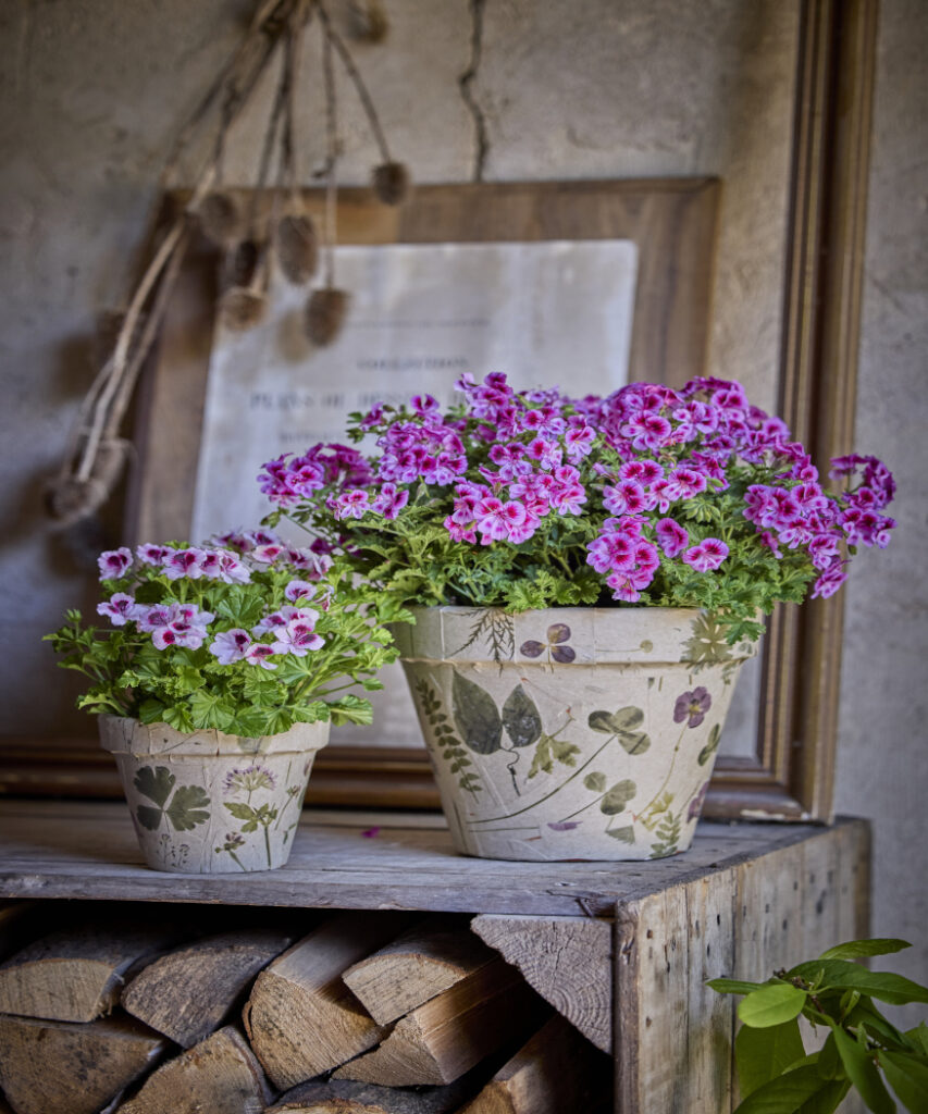 With a few simple steps, these vintage-style flowerpots, decorated with floral motifs and filled with lush, blooming geraniums, are an example of just such a gift.