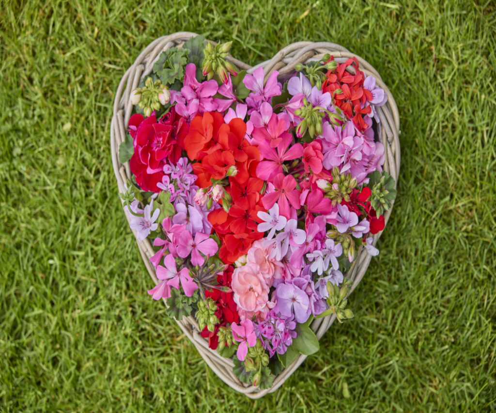 Equally expressive is a wicker heart filled with floral foam and packed with brightly coloured cut geranium flowers.