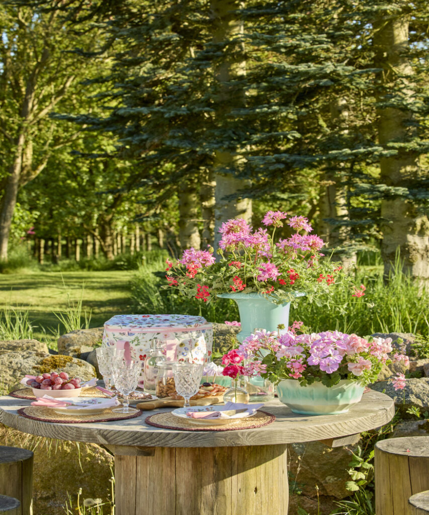 A country day out: summer picnic tables dressed with geraniums