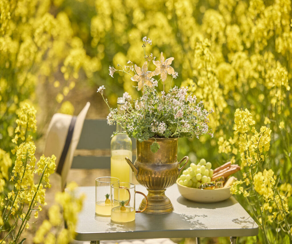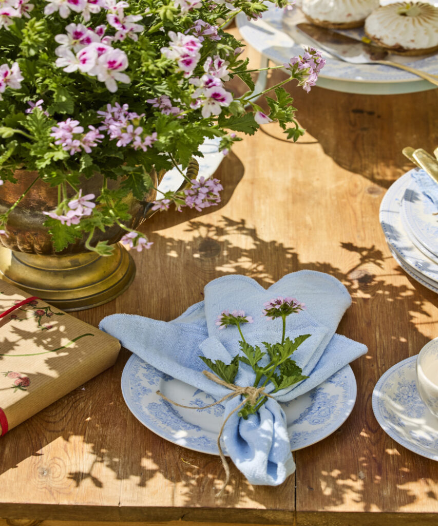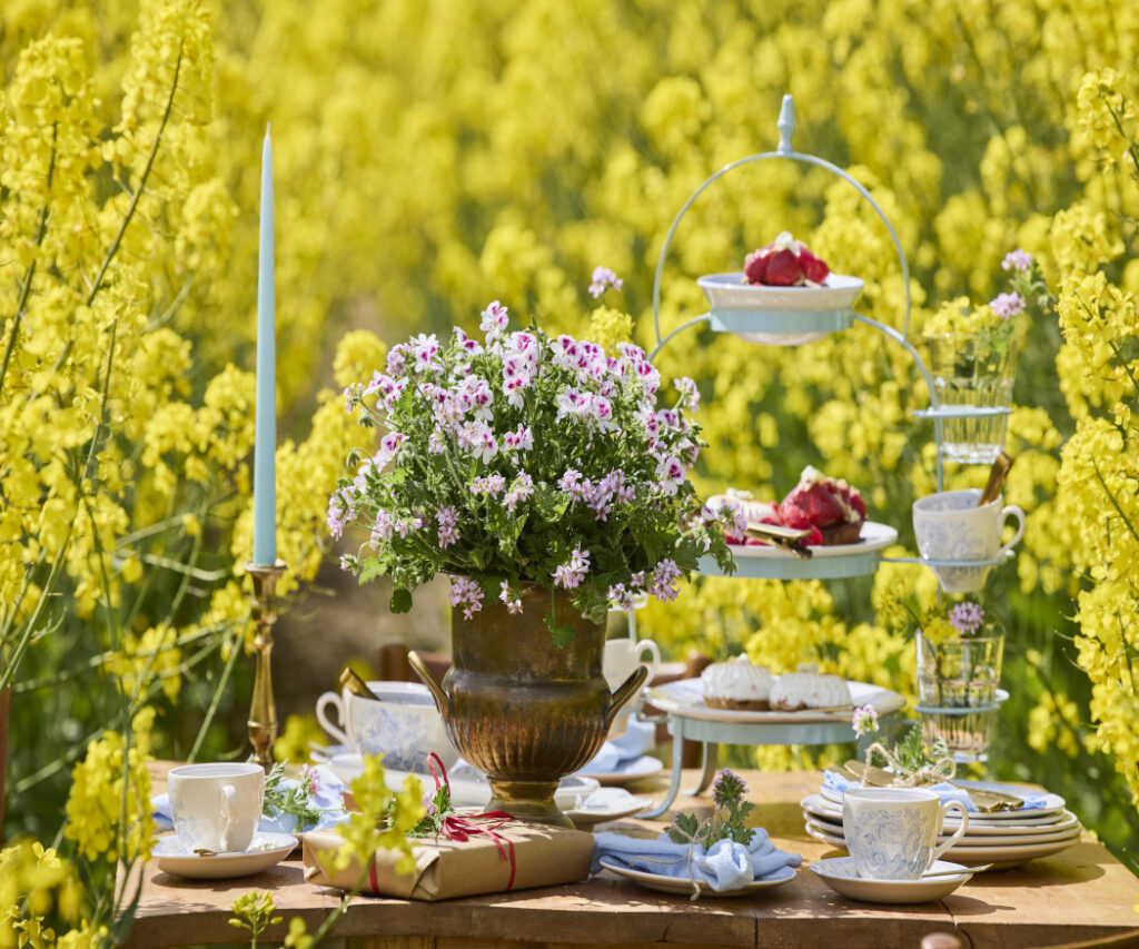 The backdrop of a summer rapeseed field is perfect for special moments. This birthday table on the left is a vision of summer: at its centre a butterfly geranium in full flower sits in a vintage urn, accompanied by a lovingly wrapped gift, fine china, homemade cakes, a candle, and artfully placed cut geraniums. This arrangement makes any outdoor celebration an unforgettable experience.