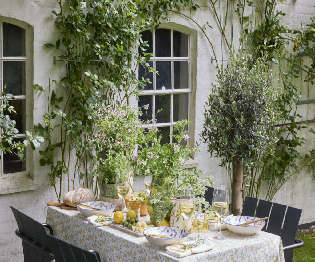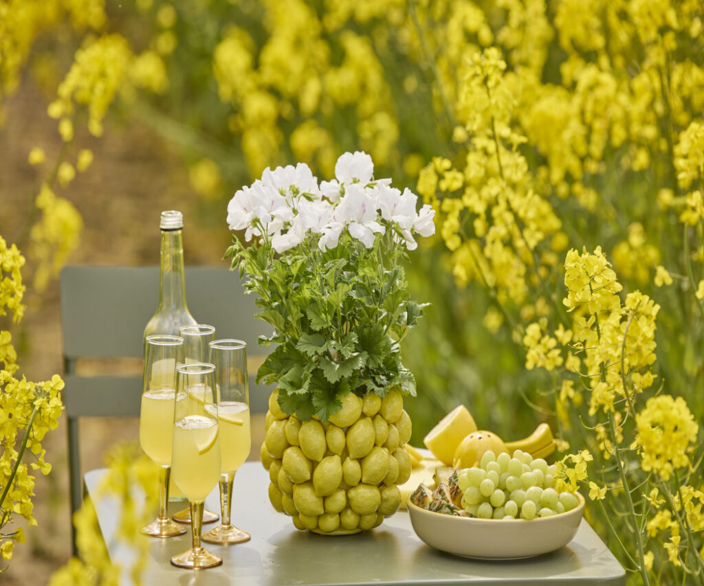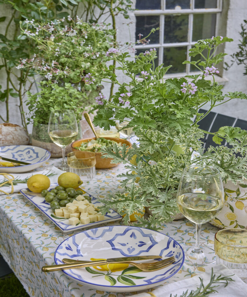 Here, scented geraniums release fresh aromas and, together with lemons, olives and white wine, they make this summery table arrangement a feast for the senses – light, carefree and full of Mediterranean joie de vivre.
