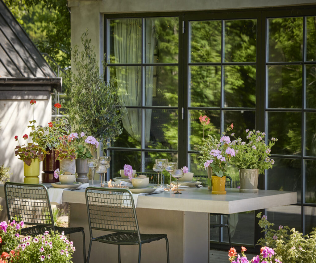 With clean lines, minimalist designs and natural materials, modern tables combine simplicity and elegance. Geraniums provide a vibrant contrast, bringing colour, lightness and a touch of summer to the setting with their flowers.