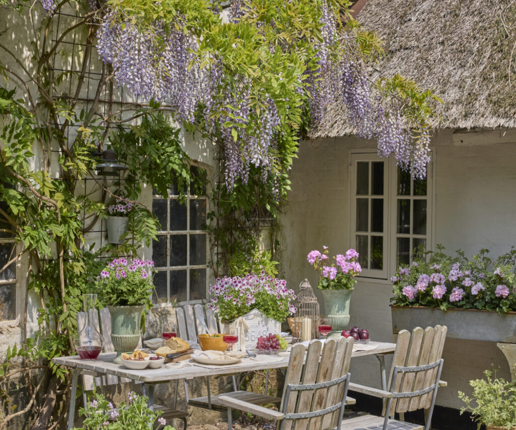 On the left, under fragrant wisteria and in front of a thatched cottage, two-tone scented geraniums and a pink flowering variety display their beauty.