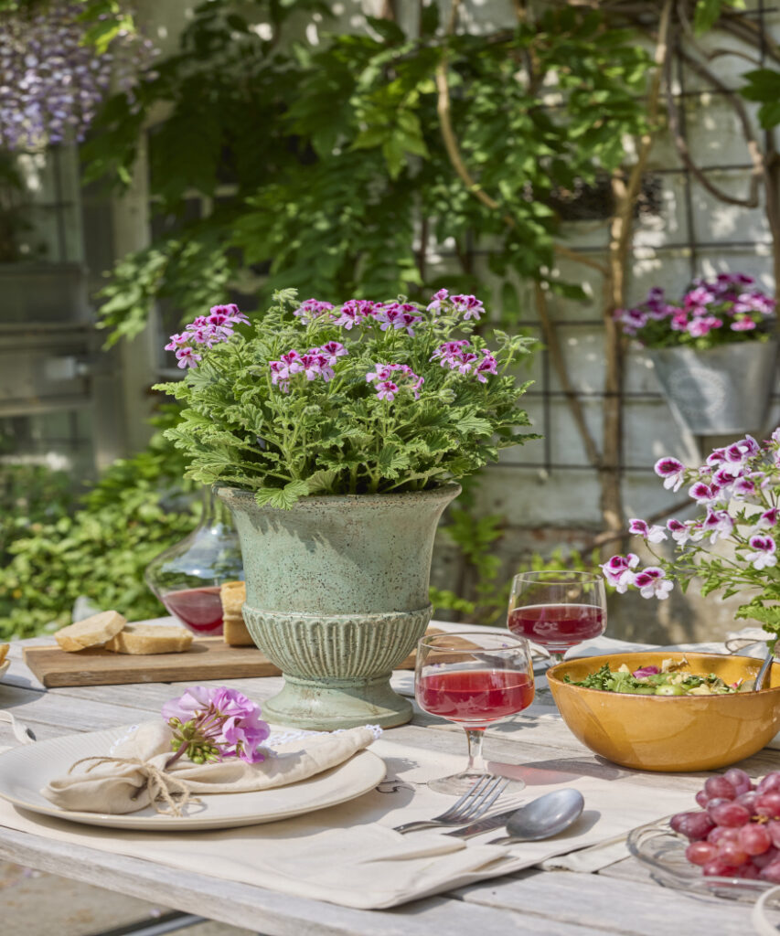 Blooming scented geraniums show off their beauty in vintage-style zinc or ceramic pots. As eye-catching flowers on a table, they lend a romantic touch to outdoor dining and bring the summer to life.