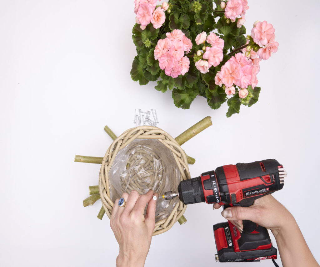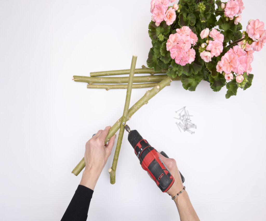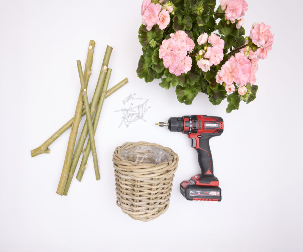 You will need 3 straight branches approx. 40cm long, 3 shorter branches approx. 20 cm long, a basket, a cordless screwdriver, screws, and a flowering geranium.